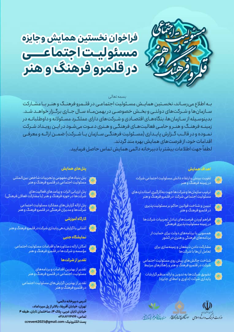 نخستین همایش مسئولیت اجتماعى در قلمرو فرهنگ وهنر با مشارکت سازمانها وشرکتهاى دولتى و بخش خصوصى در بهمن ماه سال جارى برگزار خواهد شد. بدین وسیله از سازمانها، بنگاههاى اقتصادى و شرکتهاى داراى عملکرد مسئولانه وداوطلبانه در زمینه فرهنگ و هنر و حامى فعالیتهاى فرهنگى و هنرى دعوت مى شود در این رویداد شرکت نموده ودر قالب گزارش پایدارى (مسئولیت فرهنگى سازمان یا شرکت) ضمن ارائه و معرفى اقدامات خود، از فرصت هاى همایش بهره مند گردند.